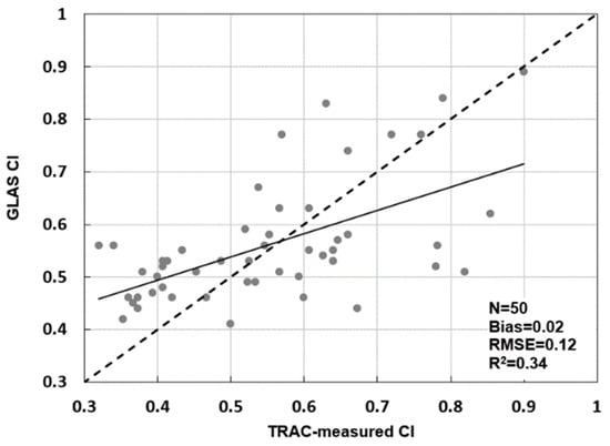 Evaluation of the GLAS CI using TRAC-measured CI. The solid line represents the linear fits of the TRAC-measured CI with GLAS CI.