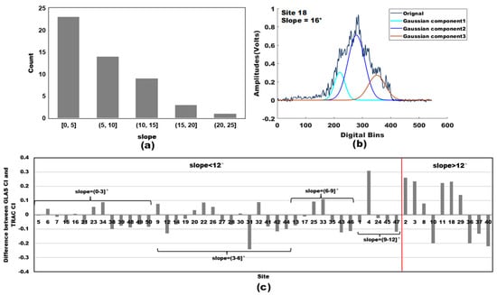(a) Slope information of GLAS footprints over Saihanba National Forest Park. (b) An example of GLAS received waveform with a large slope (i.e., slope = 16°); three Gaussian components represent different detected objects. (c) The variation of error with slope; error means the difference between GLAS CI and TRAC-measured CI.