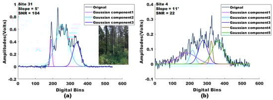 Two GLAS received waveforms corresponding to forest-covered footprints. (a) A GLAS received waveform corresponds to the forest with a multilayer distribution canopy. (b) A GLAS received waveform with a low signal-to-noise ratio.