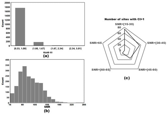 We implemented our method in Heilongjiang Province to further check the reliability of our method. Here, we only used the GLAS data with slope < 12° as input for CI retrieval because the result in Section 4.1 showed that our method performed well based on the GLAS data with slope < 12°. Finally, a total of 1942 GLAS CIs for forests were obtained, and the distribution of GLAS CI was shown in Figure 9a. Note that there are some obviously unreasonable CI values, such as CI > 1 for forest. Our ground validation analysis in Section 4.1 indicated that CI derived from the GLAS data with low SNR was questionable and unreliable. Therefore, the SNR may be the reason for these unreasonable results. To prove our conjecture, we counted the SNR of used GLAS data (Figure 9b); the result showed that there were GLAS data with bad quality, such as GLAS data with SNR < 60 []. We further analyzed the relationship between unreasonable CI values and SNR; the result showed an exciting finding: these unreasonable CI values are closely related to SNR—the number of unreasonable CI values gradually decreases as the signal quality improves; when the SNR > 65, these unreasonable CI values disappear (Figure 9c). Therefore, we can reasonably consider that our method is suitable for GLAS data with SNR > 65.