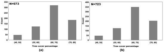 (a,b) are the distribution of tree cover percentage of MODIS pixel corresponding to the used V005-MODIS-CI and V006-MODIS-CI, respectively.