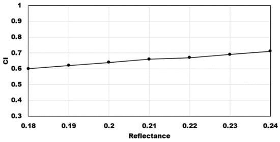 The ground reflectance is an essential input parameter in our method, but due to the limitation of observation conditions, we cannot give absolutely correct ground reflectance for each GLAS observation—incorrect ground reflectance may introduce error to the output CI. To see what role the ground reflectance played in our method, we conducted a sensitivity analysis between input ground reflectance and output CI: we varied ground reflectance from 0.18 to 0.24 to evaluate its effect on CI (Figure 14). We found that CI range variation was less than 0.1 for a moderate CI (0.6–0.7). Recall that the ground validation for our method had RMSE values of 0.07; thus, it is possible that much of our average error could be explained by spatial variation in ground reflectance.