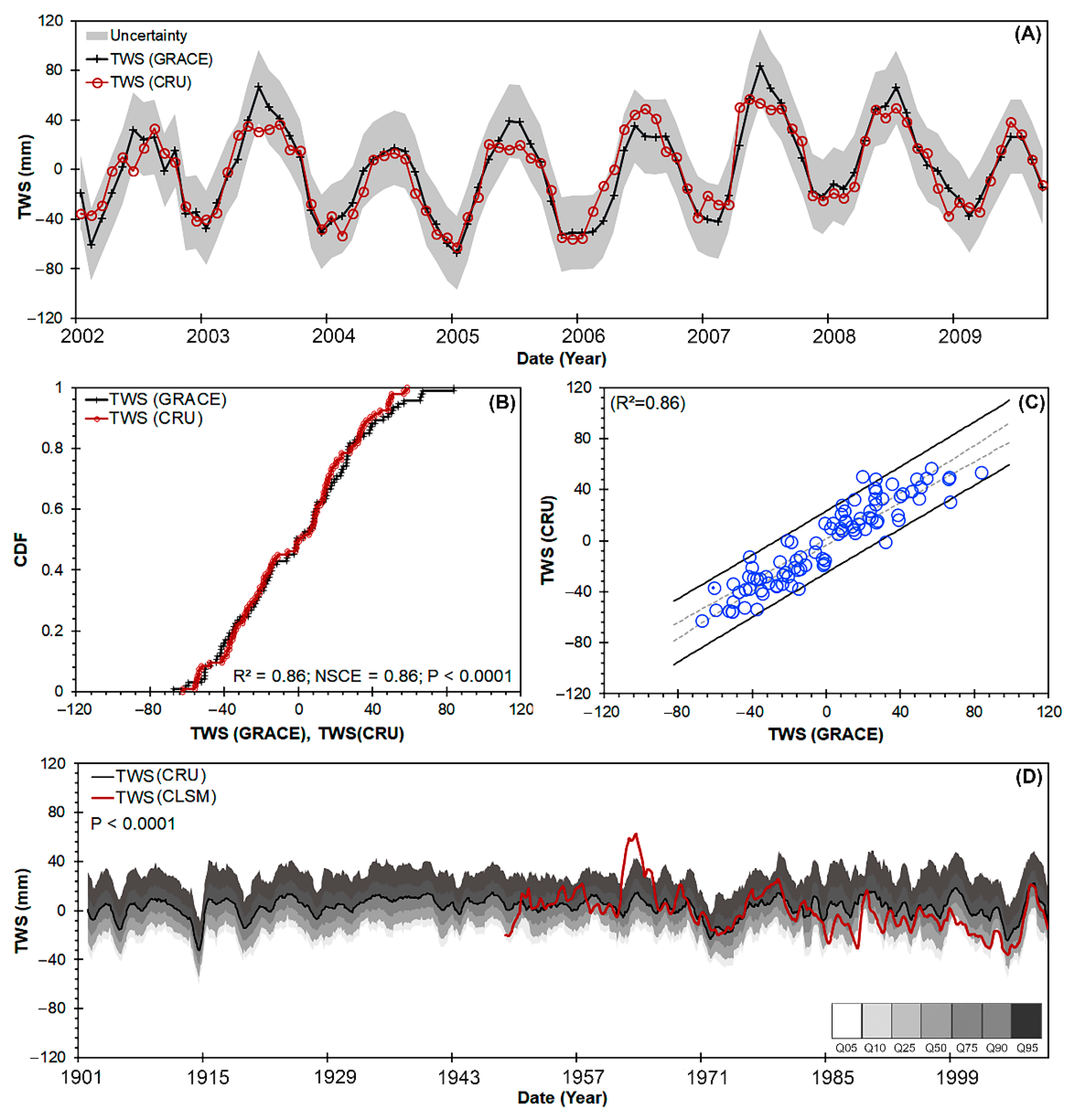 - The past and future TWS changes in the NRB between 1901 to 2002 and 2021 to 2050, respectively, were evaluated using standard evaluation criteria. Overall, the model performance showed satisfactory results. The uncertainty bounds for the extended (past and future) TWS records were illustrated using standard deviation.