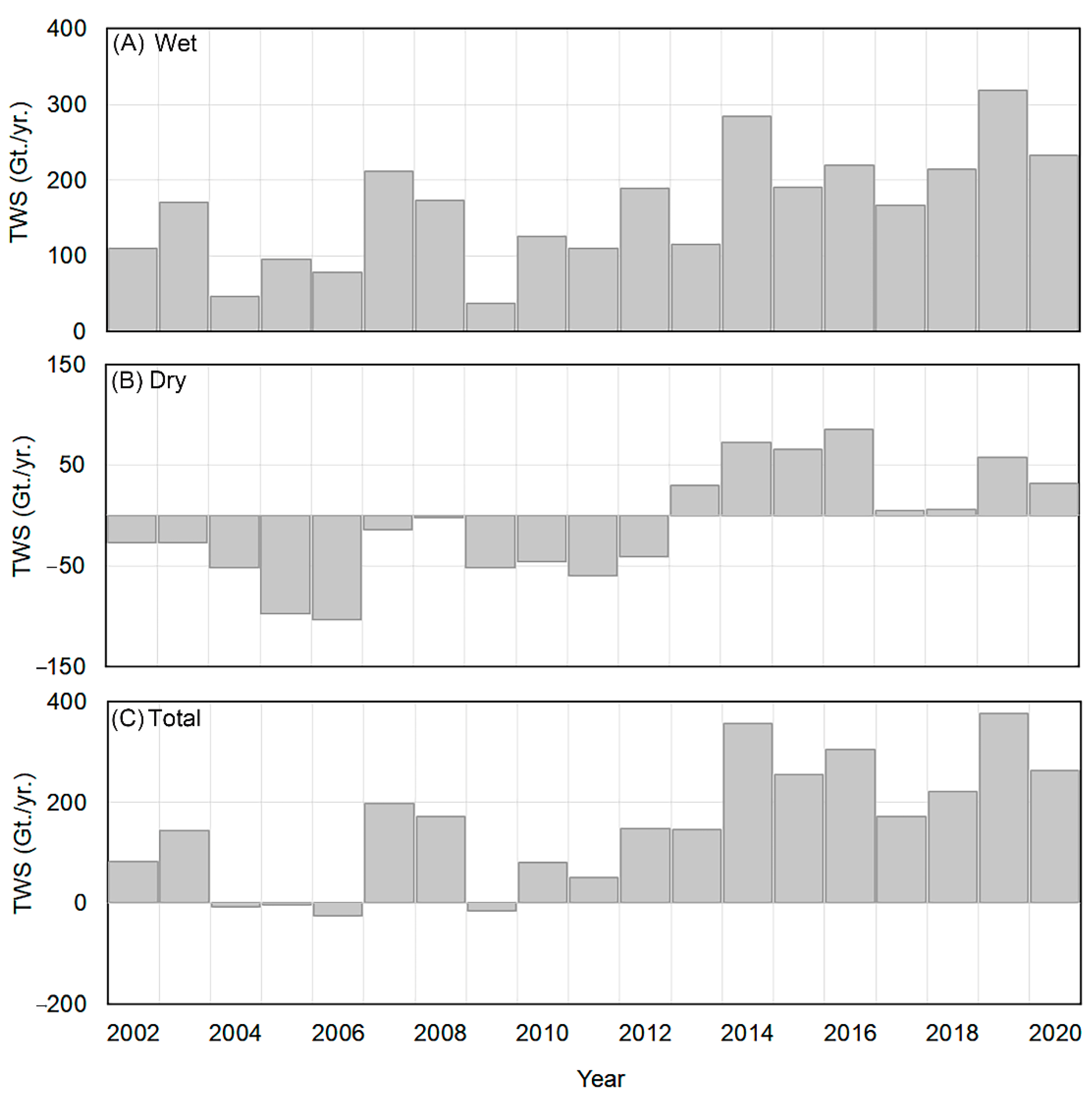 4.5.1. GRACE-Based TWSD between 2002 to 2020
