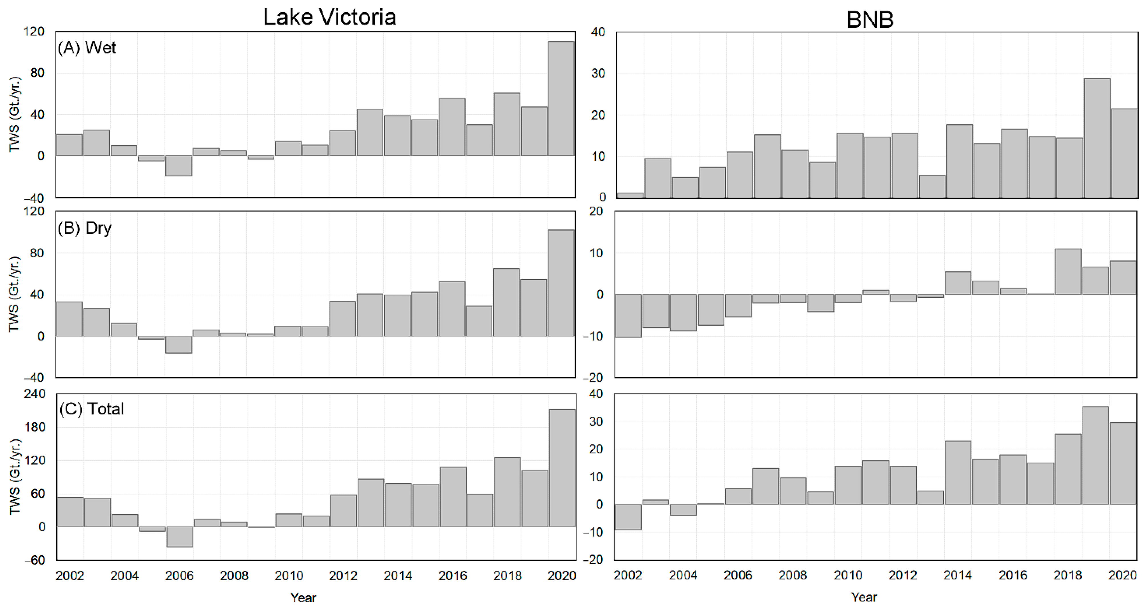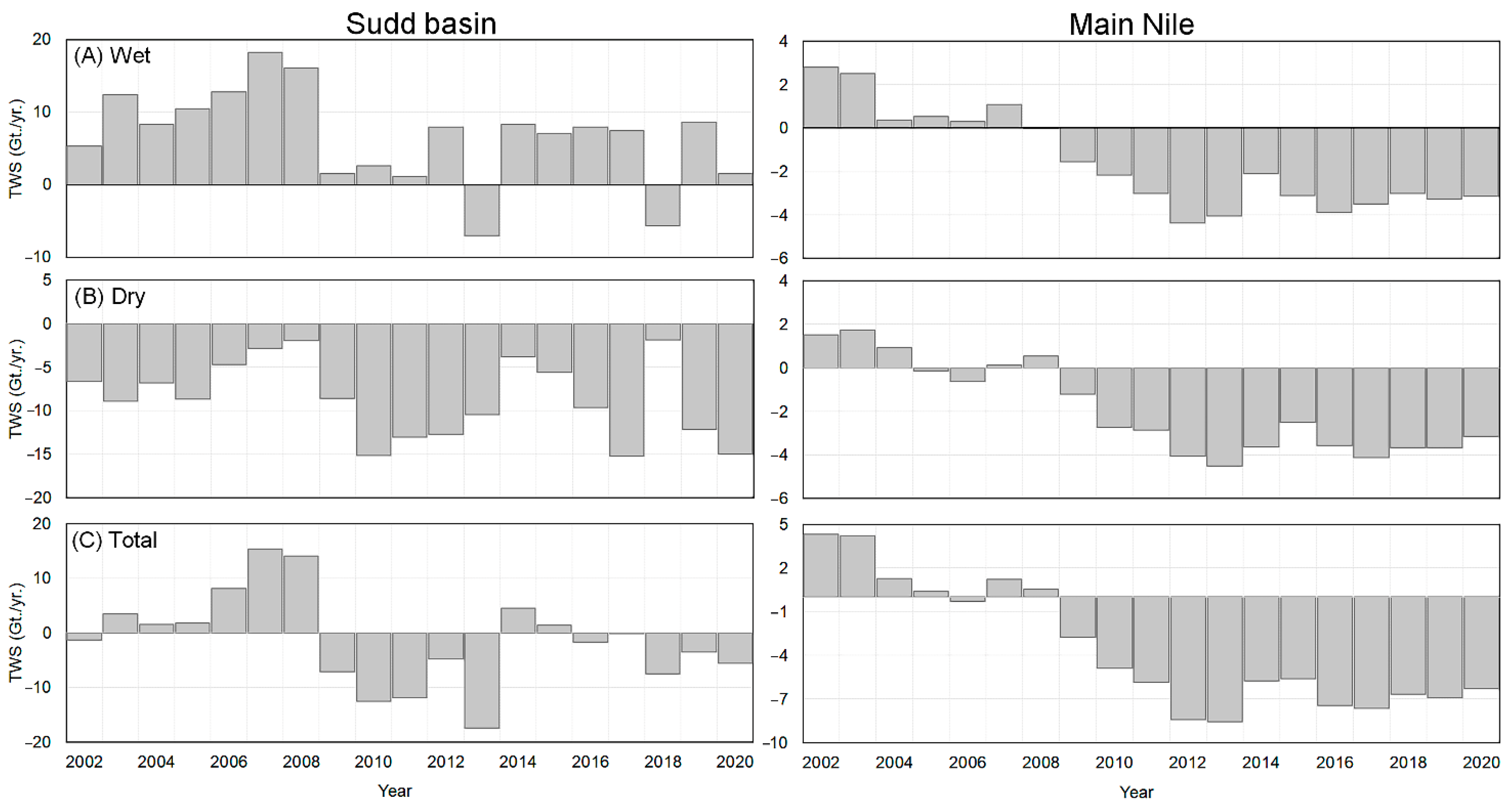 - Temporally, the net changes in TWAS were assessed during the wet, dry seasons across the NRB, two main water source regions (Lake Victoria and BNB), and two main water sink areas (Sudd and Main Nile regions).