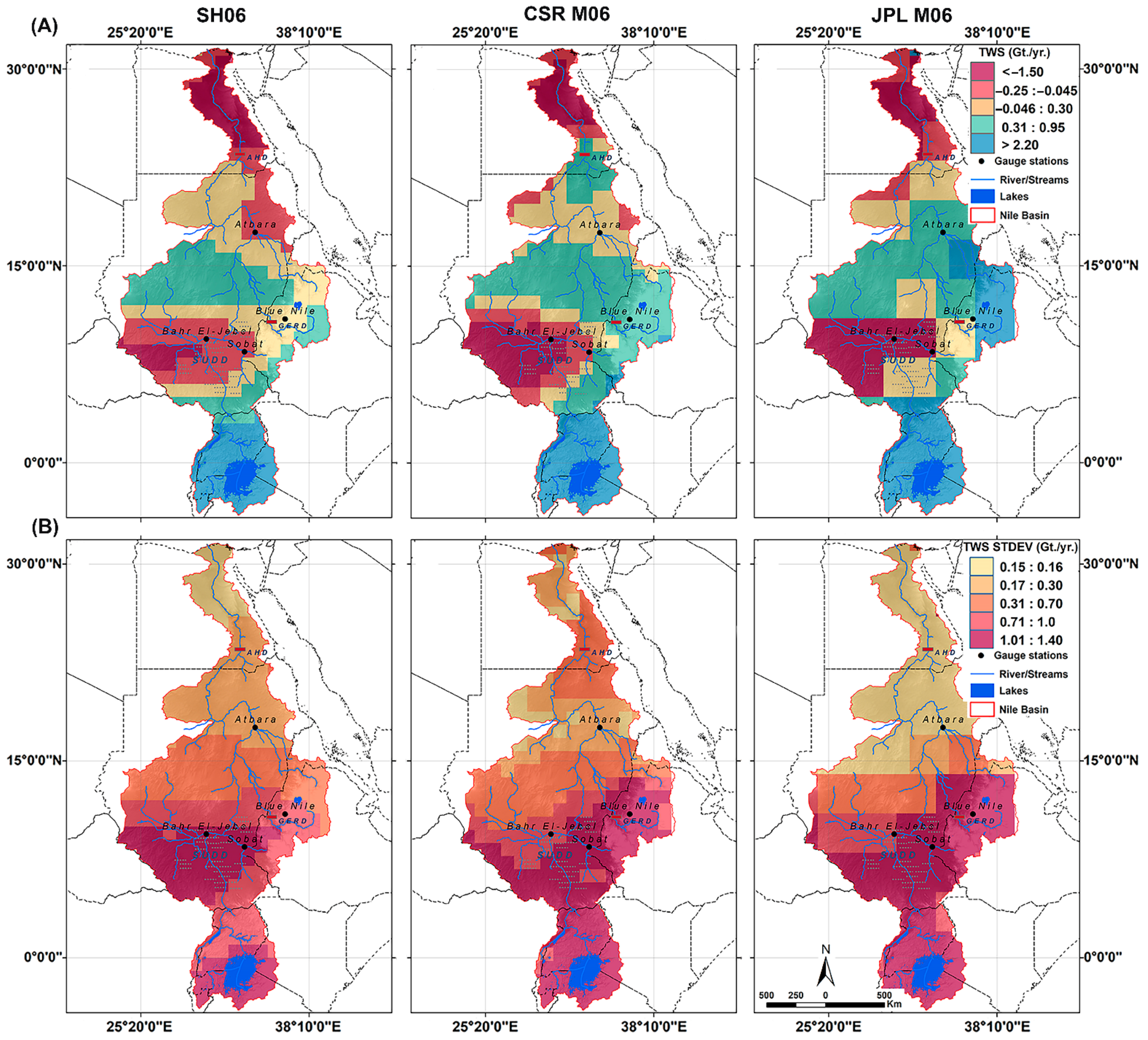 - Shamsudduha, M.; Taylor, R.G.; Jones, D.; Longuevergne, L.; Owor, M.; Tindimugaya, C. Recent changes in terrestrial water storage in the Upper Nile Basin: An evaluation of commonly used gridded GRACE products. Hydrol. Earth Syst. Sci. 2017, 21, 4533–4549. [Google Scholar] [CrossRef]