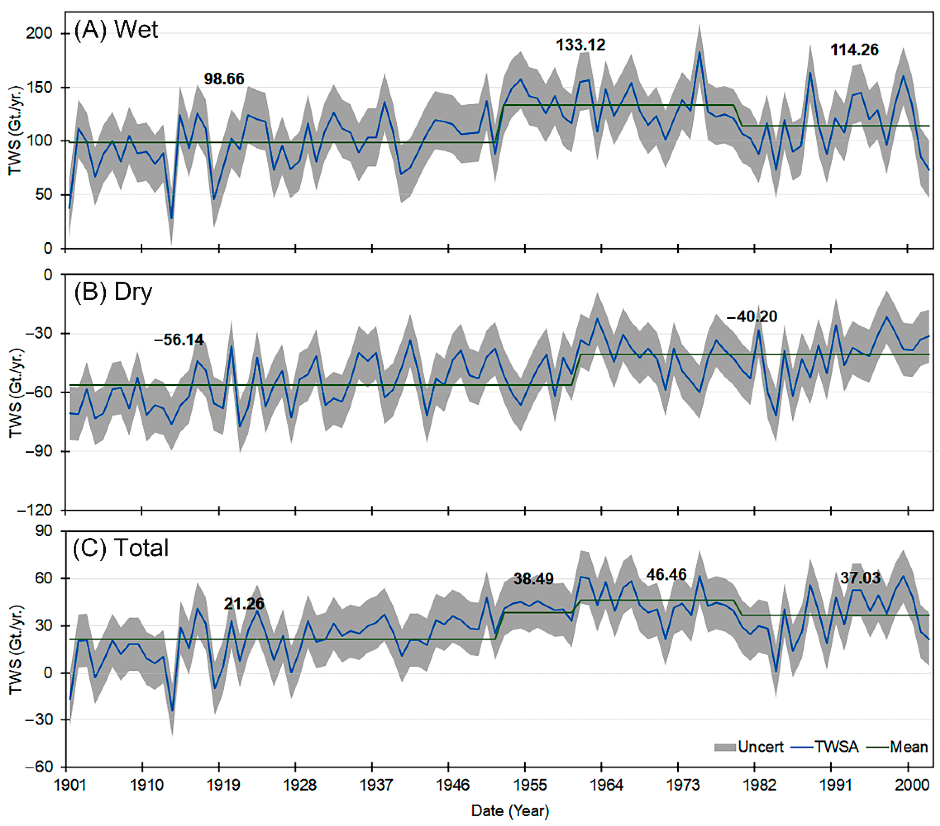 4.3. Past TWS Changes in the NRB (1901–2002)
