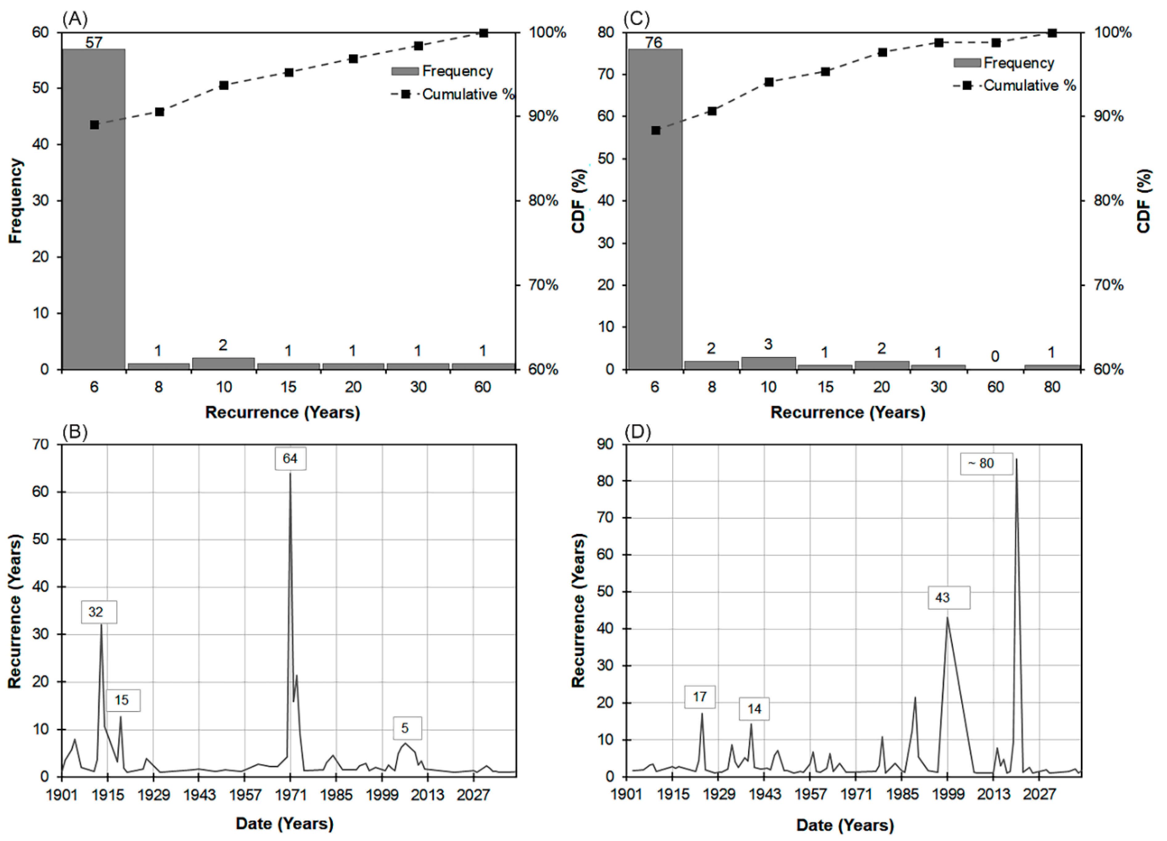 - The recurrence analysis of the drought and flooding records in the NRB between 1901 to 2050 revealed short drought and flooding intervals of ~6 years recurrence intervals.