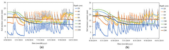 Soil moisture for surface-drip-irrigated (100% of the commercial rate (CR)) grapevine treatment blocks pertinent to the (a) 2018 and (b) 2019 growth seasons.