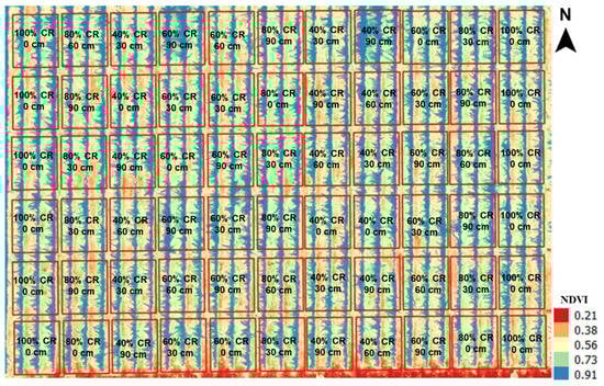 UAS-based imagery was preprocessed as described by Chandel et al. [], and five surface reflectance, one surface temperature, and one digital elevation model (DEM) orthomosaics were obtained. Figure 3 shows a sample normalized difference vegetation index (NDVI) orthomosaic with irrigation treatments in Block 2.