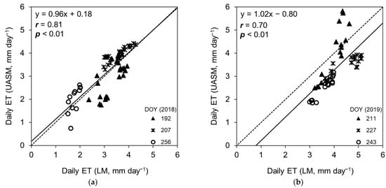 Comparison plots between daily ET estimates from UASM and LM approaches for grapevines irrigated at the commercial rate on selected days for the (a) 2018 and (b) 2019 growing seasons. DOY: day of the year.