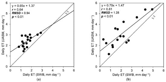 UASM-derived daily ET estimates (2.70 ± 1.03 mm day−1) were significantly higher (two-sample t-test, t-stat = −4.14, p < 0.001) than the ET calculated by the SWB approach (1.80 ± 0.98 mm day−1). However, ET estimates were strongly correlated (r = 0.64–0.81, p < 0.01, Figure 6) with each other in both seasons.