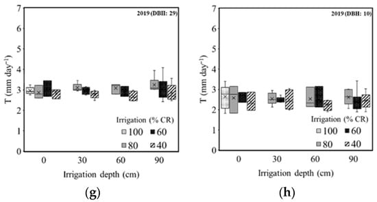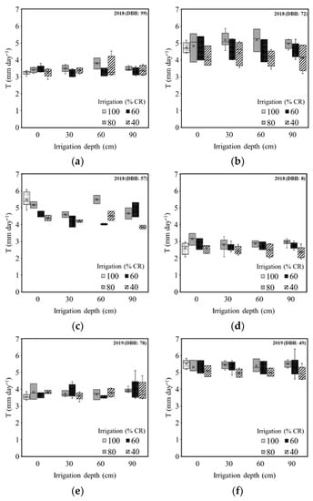 The UASM-T maps showed a significant effect of irrigation rates on grapevine water use, as quantified by T for both seasons (two-way ANOVA, F-stat = 7.38–7.78, p < 0.001). However, the DRZ irrigation depth or its interaction with irrigation rates did not have significant effects on water use estimates (p > 0.05). Moreover, no effects were observed at the start of irrigation treatments (DBH: 99 (2018) and DBH: 78 (2019)). For all other imaging campaigns, the mean T of grapevines irrigated at 100% or 80% of the CR was highest, followed by that of grapevines irrigated at 60% and 40% of the CR (Figure 7). The treatment effect was also insignificant on the 10th DBH of the 2019 season, possibly due to a recent irrigation activity (11 DBH).