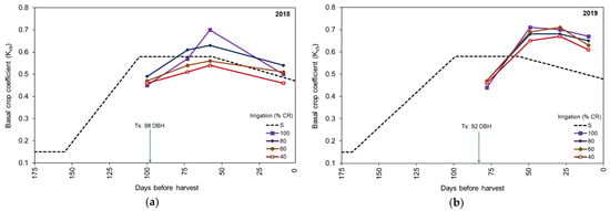 Basal crop coefficient curves derived from UASM-T maps (non-dotted lines) for grapevines irrigated at different rates in the (a) 2018, and (b) 2019 growth seasons (Ts: treatment start day; S represents locally adjusted standard basal crop coefficient curve pertinent to non-stressed canopy; 40%, 60%, and 80% of the CR were DRZ, and 100% of the CR was surface drip irrigation).