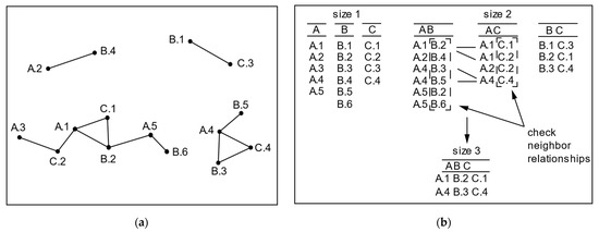 In Figure 1a, each instance is uniquely identified by , where T is the spatial feature type and i is the unique ID inside each spatial feature type, and the lines between instances represent neighbor relationships. Figure 1b shows the instances of co-location being generated by instance joins. A maximal instance is a row instance that does not appear as a subset of another row instance. In other words, maximal instances cannot combine with other instances to generate row instances of higher-size co-locations. For example, in Figure 1a is not a maximal instance since it is a subset of the row instance , which in turn is a maximal instance. A maximal instance must be a maximal clique (a maximal clique is defined as a clique that does not appear as a subset of another clique in the same co-location pattern), but a maximal clique may not be a maximal instance since maximal cliques may not be row instances. Assuming , , and ( is an instance of A, and and are instances of B) form a clique, i.e., they are neighbors to each other, {, , } is a maximal clique rather than a maximal instance as it is not a row instance. However, is a maximal instance and also a maximal clique.
