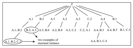 None of the neighbor relationships is omitted in the process of finding maximal instances. All the spatial instances are scanned, and all neighbor relationships between instances of different spatial types are considered in the process of constructing an RI-tree. Although not all neighbor relationships are shown in the RI-tree, they are considered when creating nodes. For example, the node “” contains the neighbor relationships between and , and , and and , although the neighbor relationships between and on one hand and and on the other are not shown in the RI-tree. The neighbor relationships are also not duplicated. Once all neighbor relationships of an instance are identified, this instance will be deleted in F.
