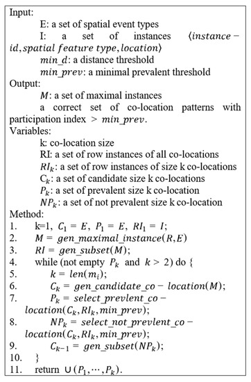 This section introduces the steps in the maximal instance algorithm. As shown in Figure 4, this algorithm has four steps in the flow chart. The participation index is still used as the prevalence measure to determine whether a co-location pattern is prevalent. As shown in Figure 5, the maximal instance algorithm takes a set E of spatial event types, a set I of instances, a distance threshold , and a minimal prevalent threshold . The algorithm outputs a correct set of co-location patterns with participation index . The set of candidate size 1 co-locations and the set of prevalent size 1 co-locations are initialized to E, since the value of the participate index is 1 for all size 1 co-locations. The set of row instances of size 1 co-locations is initialized to I.