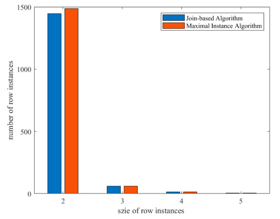 Figure 7 shows a comparison of row instances generated by the join-based algorithm a and the maximal instance algorithm. Row instance is the basis of co-location participation index. Only when the number of row instances is clear can the participation index of co-locations be calculated and whether co-locations are frequent be judged. Therefore, this paper used the join-based algorithm and the maximal instance algorithm to generate all the row instances, recorded the number of row instances in each size, and made a comparison. The results show that the number of size 3, size 4, and size 5 row instances generated by the two algorithms is the same and only the number of size 2 row instances is slightly different. The maximal instance algorithm generates 42 more size 2 row instances than the join-based algorithm, which is because the maximal instance algorithm generates 42 repeated maximal instances in the size 2 maximal instances. The impact of these 42 row instances on participation is very small.