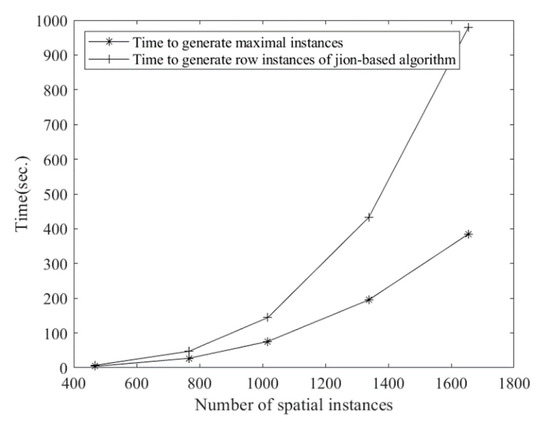 The star neighborhood partition model in the join-less algorithm takes each spatial object as a central object and finds out the remaining objects in its neighborhood. Thus, this process is performed n times, where n is the number of spatial objects. The process of generating all maximal instances needs to be executed times, where is the number of maximal instances. Apparently, , so the star neighborhood partition model in the join-less method is more time consuming than the process of generating the maximal instance in our method.