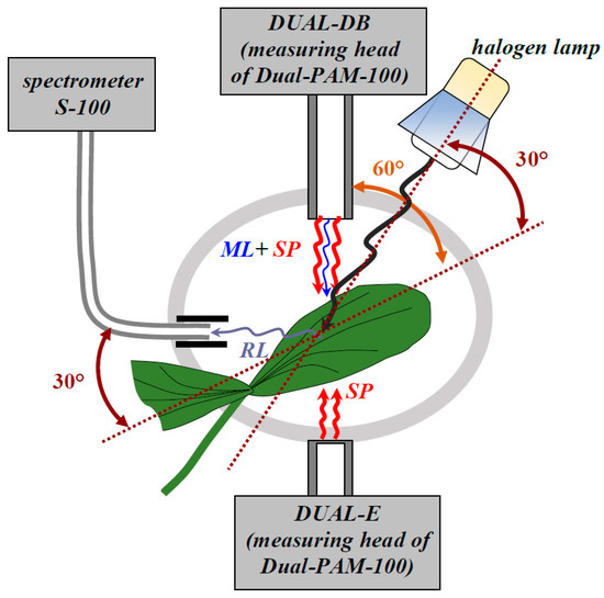 The photosynthetic parameters and intensity of reflected light were simultaneously measured in leaves, as described in our previous works [52,80,92,93]. A halogen lamp (3000 K, 20 W, 12 V; Osram Decostar, OSRAM GmbH, Munich, Germany) was the source of white actinic light. The intensity of leaf illumination was about 630 μmol m−2 s−1. The distance from the halogen lamp to the leaf was about 15 cm; the angle between the leaf’s surface and the direction of the actinic light was about 30°. The white actinic light was turned on after the measurement of maximal quantum yield of photosystem II (Fv/Fm). The total duration of plant illumination by halogen lamp was about 9 min.
