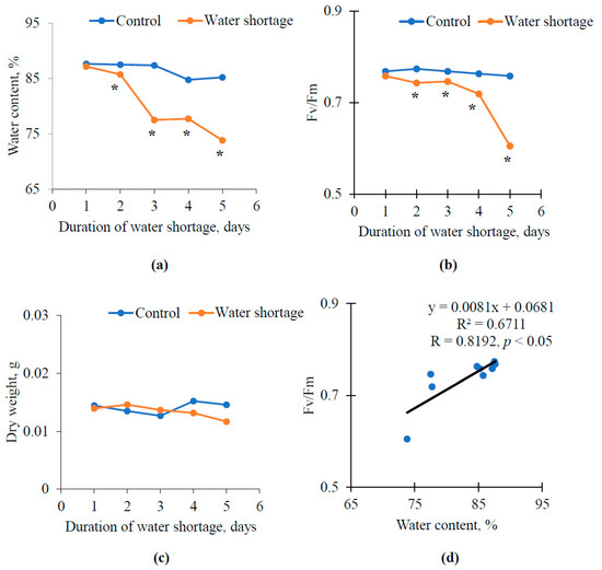 Dynamics of the relative water content (a), photosynthetic maximal quantum yield (Fv/Fm) (b), and dry wight (c) in leaves of pea seedlings subjected to the water shortage and a scatter plot between the relative water content and Fv/Fm (d). The relative water content and dry wight were calculated per leaf. Control plants were irrigated every two days, irrigation was not used for five days in experiment. R2 and R are determination and correlation coefficients. Medians are shown in the figure. * Value significantly differed from control (p < 0.05, Mann–Whitney U test).