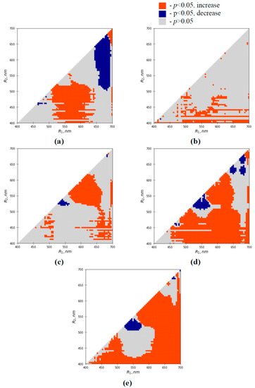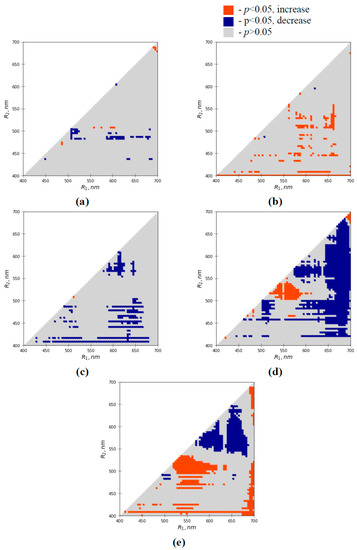Heatmaps of significances and directions of water shortage-induced changes in absolute values of RIs in pea leaves in the first (a), second (b), third (c), fourth (d), and fifth (e) days of the water shortage. RIs were calculated based on equation , where I(R1) and I(R2) are intensities of reflected light at different narrow spectral bands (averaged for 3 nm). The Mann–Whitney U test was used for p calculations.