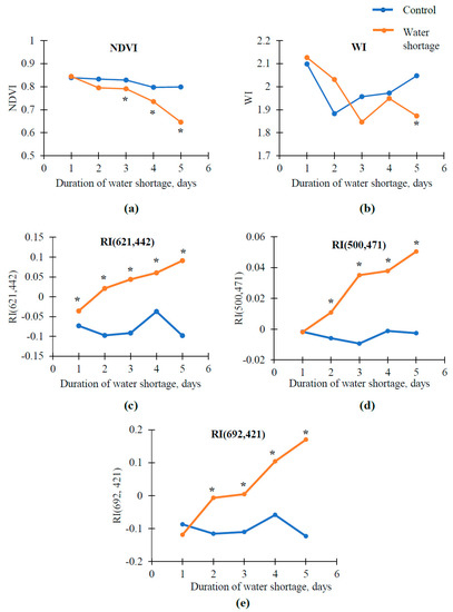 Dependence of (a) the normalized difference vegetation index (NDVI), (b) the water index (WI), (c) the difference reflectance index RI(621,442) was calculated based on R1 = 621 nm and R2 = 442 nm, (d) the difference reflectance index RI(500,471) was calculated based on R1 = 500 nm and R2 = 471 nm, and (e) the difference reflectance index RI(692,421) was calculated based on R1 = 692 nm and R2 = 421 nm for pea seedlings over duration of water shortage. Experimental plants were not irrigated; controls were irrigated every two days. Medians are shown in the figure. * Value significantly differed from control (p < 0.05, Mann–Whitney U test).