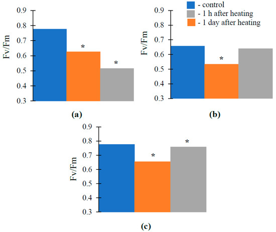 It was shown that Fv/Fm was significantly decreased in 1 h after the short-term heating in pea, wheat, and pumpkin seedlings (Figure 6). In pea, Fv/Fm did not recover in one day after the heating. In wheat and pumpkin, Fv/Fm partially recovered in this time.