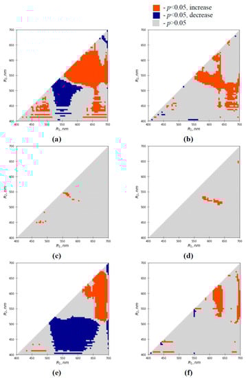 Heatmaps of significances and directions of heating-induced changes in absolute values of RIs in pea leaves in (a) 1 h and (b) one day after the heating, wheat leaves in (c) 1 h and (d) one day after the heating, and pumpkin leaves in (e) 1 h and (f) one day after the heating. RIs were calculated based on the equation , where I(R1) and I(R2) are intensities of reflected light at different narrow spectral bands (averaged for 3 nm). The Mann–Whitney U test was used for p calculations.