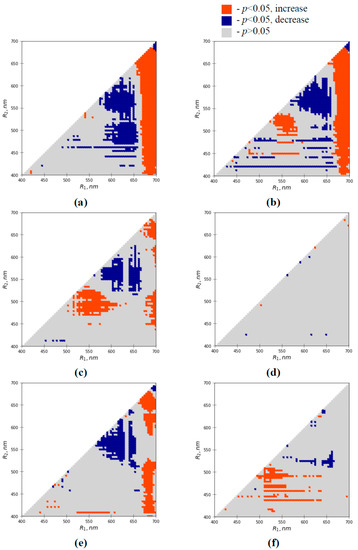 The results showed that the water shortage action could influence the number of RIs; changes in their absolute values were more expressive than changes in ΔRIs. Several spectral regions with significant differences between RIs (or ΔRIs) were observed in specific days of the water shortage. For example, a large spectral region with decreased RIs (R1 was about 640-690 nm, R2 was about 500–650 nm) was revealed in the first day (Figure 3a) but it was absent in the second day (Figure 3b). In contrast, there were spectral regions with significant differences which were observed for several days of the water shortage. For example, a large spectral region with increased RIs (R1 was about 560–640 nm, R2 was about 520–600 nm) was observed since the third day of the water shortage (Figure 3c–e).