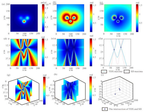 Three spheres with coordinates of x0, y0, z0 are (75 m, 100 m, 20 m), (125 m, 100 m, 15 m), and (100 m, 75 m, 10 m), respectively. The gravity anomaly is shown in Figure 1a. Figure 1b,c is the TDX and SD edge detection results of anomaly in Figure 1a. It can be seen that the SD result of the sphere model is more convergent than the TDX result. Then, we calculate the spatial results of TDX and SD. To show the imaging results more clearly, we show the slice (x = 100 m) that contains the centers of two spheres. From the slice results, we can see that there are two extremum lines of TDX and SD for each sphere, and the two extremum lines of the two edge detection methods intersect at the center of the sphere (Figure 1d–e). We put the extremum lines of TDX and SD together in Figure 1f, which shows that the intersections of TDX and SD extremum lines are at the centers of the spheres. Figure 1g,h show the spatial TDX and SD results of three-dimensional anomaly in the lower half space, and the slice positions are x = 100 m and y = 100 m, passing through the centers of three sphere models. Three intersection points, obtained by extracting the intersection of two edge detection results, are at the center of the sphere model, which are (75 m, 100 m, 20 m), (125 m, 100 m, 15 m), and (100 m, 75 m, 10 m) (Figure 1i). The sphere model example proves that our method can accurately and quickly obtain the position of geological body.