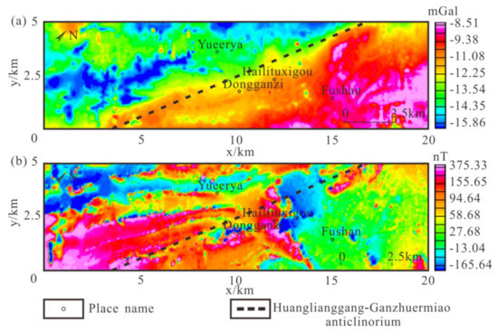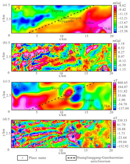 The data used in this paper were measured and processed by the authors’ team in June 2018, and they are 1:5000 scale airborne gravity and aeromagnetic data. The measured direction is northwest and the measured flight altitude is about 100 m. The error of airborne gravity measurement is about 0.62 mGal and that of the aeromagnetic measurement is 2.26 nT. The measured area is 5 × 20 km. Because the horizontal range is small, we will use a rectangular coordinate system for the application of the method. Figure 6a shows the Bouguer gravity anomaly map of the Shuangjianzishan Baiyinnuoer area (the Bouguer gravity anomaly and its physical significance are shown in Appendix A). It can be seen that there is an obvious gravity gradient belt in this area, the strike of gravity anomaly is in the NE direction, and the anomaly rises from West to East. It corresponds to the Huanggangliang Ganzhuermiao anticline—the strike is in the NNE direction).