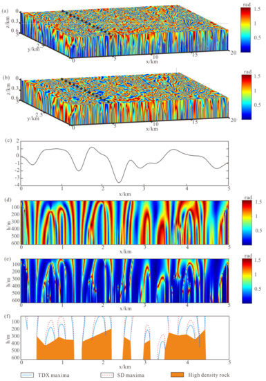 (a) 3D TDX results of the study area; (b) 3D SD results of the study area; (c) Gravity anomaly of x = 5 km profile; (d) TDX profile of x = 5 km profile; (e) SD profile of x = 5 km profile; (f) Inversion results of x = 5 km profile.