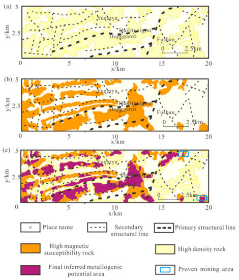 Delineation of metallogenic potential area: (a) High density rocks delineated by gravity anomalies; (b) High magnetic susceptibility rocks delineated by magnetic anomalies; (c) Final inferred metallogenic potential area.