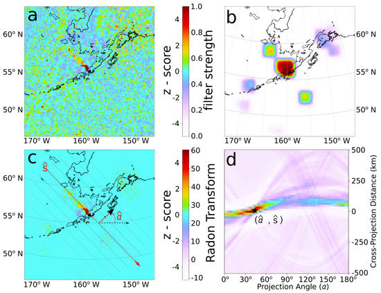 Plume dispersal direction identification procedure for the plume observed from Veniaminof Volcano; 23 October 2018 12:30 UTC–14:12 UTC. (a) Volcano-centered grid of raw CrIS-derived z-scores. (b) Specialized weighting filter combining radial Gaussian and detection region buffer. (c) Filtered z-score grid used as input to plume rotation scheme. (d) Radon Transform of (c) showing the maximizing point in projection space. This special point corresponds to the optimal plume axis projection line shown in (c).