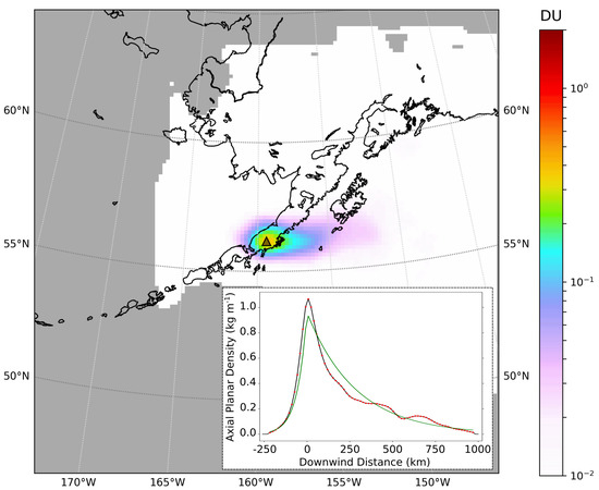September-December 2018 time-averaged plume for Veniaminof volcano (VCD measured in Dobson Units, DU). Inset: APD profile (red dots) and APD model fit (green), .