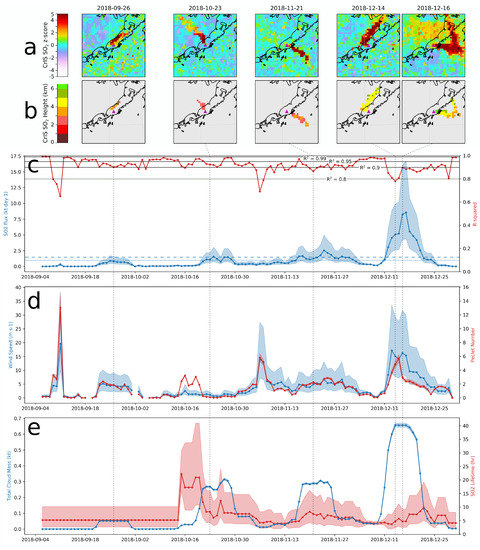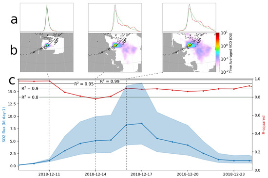 During this eruptive period, there were principally four episodes of heightened emission. In some cases, these were characterized by a single short-duration, but sustained emission (late September), whereas other periods such as the increased flux in mid–late November were characterized by a sequence of pulses. In some cases, the peak fluxes do not coincide exactly with known periods explosions and ash emission, most notably, the significant explosive activity during 21–22 Nov. during which the AVO ACC/VAL were RED/Warning yet the flux peaked 3 days later. This example is most likely an artifact of the centered time-averaging (±5 days), which captured not only this significant release which itself lasted approximately 2 days, but also the fact that there were greater emissions following this event than preceding it. The largest emission occurred in mid-December with significant plumes dispersing north and northeast. This period of emission is discussed in greater detail below. Overall, the 4-month averaged flux (blue dashed line, Figure 4c) is substantially similar to the average of the time series of fluxes (blue dotted line, Figure 4c), although they are not exactly comparable owing to the statistics of lognormal variables. Although this capability yields intriguing details of emissions during this poorly understood eruption, a full analysis and geological interpretation of this eruptive sequence are beyond the scope of this work.