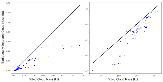 From [6], CrIS VCD data generally agrees very well with high-resolution data from TROPOMI for small to moderate columns (<50 DU) and tends to underestimate very large TROPOMI columns by about 25% consistently across a variety of scales. Because the vast majority of the data analyzed here are below this threshold and TROPOMI data uncertainties are approximately 30–50% of those of OMI [13], we estimate that the errors originating from the use of CrIS to compute total cloud mass are somewhat less than those from OMI. We estimate the uncertainty on the CrIS VCDs in each plume image as approximately 14% for these relatively dilute plumes and as much as 20% for plumes with a large fraction of columns DU, though these are uncommon outside of significant eruptive events. The estimation of VCD from z-scores is expected to have a very small impact on total error.