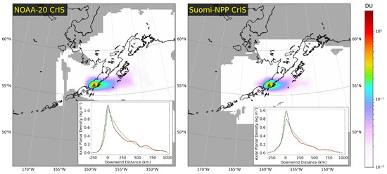 As described above, this algorithm uses a radial Gaussian search weight parameterized by a soft search radius () with a hard cutoff at rather than a single hard search radius cutoff as in [3,13] and others. For the case study of Veniaminof, we used a soft search radius of 150 km, meaning that there is a hard cutoff at 600 km and that theoretically 95% of the dispersing plumes should be located within 300 km. Although this search is used to determine the wind-reconstruction, the stacked data spans over a box 1000 km × 1000 km. Over this 4-month eruptive period, SNPP and NOAA-20 together collected 493 plume snapshots comprising about VCD estimates, generating the time-averaged plume in Figure 3 with fitting results summarized in Table 1. Although the VCD values used here are estimated from the gridded CrIS z-scores (Figure 4a) and a conversion factor generated only from the most robust retrievals, there are enough samples to make a credible time-average. Despite this, there is still a subtle bend in the plume axis, which is the result of accumulating many plumes which themselves have been dispersed in complex wind fields (e.g., the individual plumes in Figure 4a). This crosswind asymmetry justifies the theoretical benefits of performing the fitting on an APD profile (Figure 3 inset) rather than a VCD grid.