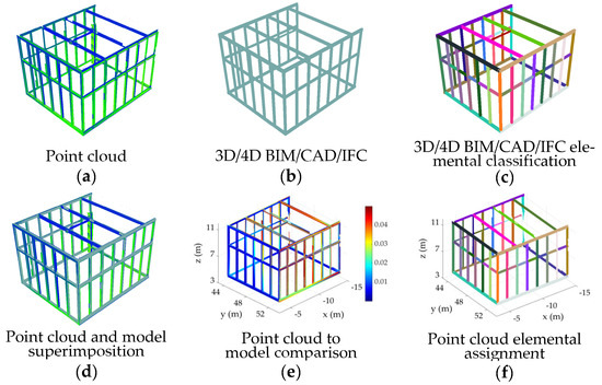 Typical framework for automatic assignment of points to the designed multi-dimensional (n-D) information model elements: (a) point cloud, (b) n-D information model, (c) elemental classification of the designed model, (d) superimposition of the point cloud and the model, (e) point-cloud-to-model comparison (in this case, the color represents the distance of the points to the closest element’s surface), and (f) result of assignment of the point cloud to the corresponding elements.
