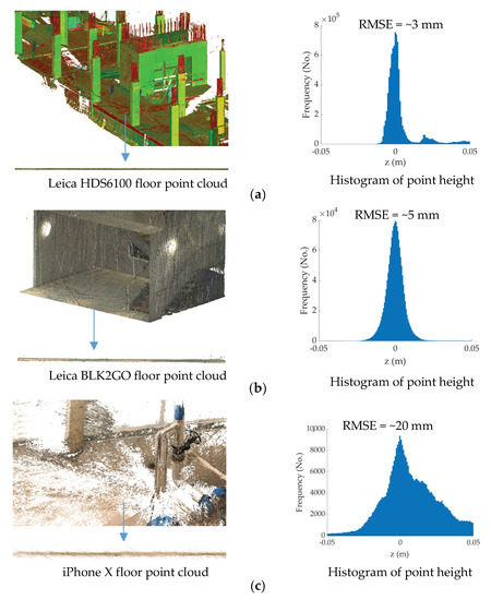 Point clouds can be acquired through different means, such as terrestrial laser scanners (TLS; Figure 2a), simultaneous localization and mapping (SLAM)-based mobile systems (Figure 2b), and structure-from-motion (SfM)-based photogrammetric 3D reconstruction (Figure 2c). Each point cloud collection technique has unique characteristics that impact the level of spatial uncertainty of each point measurement. A generic framework to automate point cloud processing for construction projects must, hence, incorporate the impact of point measurement uncertainties corresponding to the optical instrument [35]. Figure 2 sheds light on the importance of integrating the expected point measurement uncertainties within automated point-cloud-processing frameworks. Figure 2 (right) shows histograms of point height, which have been shown to be an effective tool in extracting flat slab floors and ceilings from point clouds [36,37]. The points in the vicinity of the mode of the histograms represent the points of the floor (base slab). For reference, the root-mean-square error (RMSE) of the points on the floor for each histogram is also shown. As illustrated, the RMSE changes from 3 mm for TLS (Figure 2a, right) to 20 mm for dense 3D reconstruction from smartphone cameras (Figure 2c, right). This shows that if, for instance, a fixed distance threshold of, say, 5 mm is adopted to assign points around the mode of the histogram as floors, 99% of the TLS and only 32% of the smartphone 3D reconstruction points will be identified as belonging to the floor. Therefore, a successful distance threshold (Figure 1f) must incorporate the expected point measurement uncertainties related to a particular point cloud instrument [16,26,38,39].