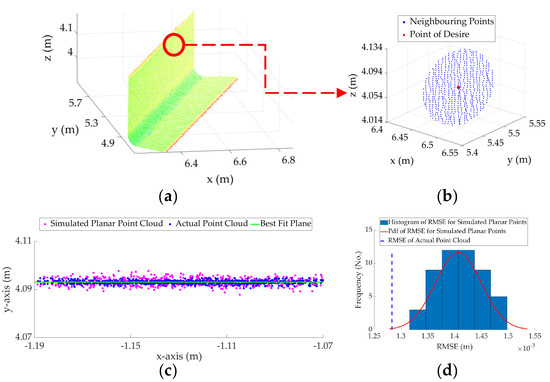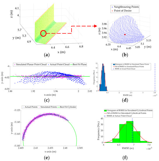 Figure 9 shows the process, described in Algorithm 2, for a neighborhood of points following a planar pattern. It can be observed from Figure 9d that the RMSE of the original point cloud neighborhood of Figure 9b is much smaller than even the mean of the probability distribution function of the RMSE of the simulated points, indicating that the point considered in Figure 9 satisfies Equation (2) and follows a planar pattern. This is, in fact, not the case for the cylindrical neighborhood, shown in Figure 10. For the cylindrical neighborhood, if the points are projected onto the best-fit plane, the RMSE of the best-fit plane to the cylindrical points considerably exceeds the maximum of the probability distribution of the RMSE of the simulated planar points (Figure 10d). Alternatively, if a cylinder is fitted to the cylindrical points, the RMSE of the best-fit cylinder is within the probability distribution of the RMSE of the simulated cylindrical surface and satisfies the requirement set in Equation (2) (Figure 10f). Therefore, the point considered in Figure 9 will be classified as a plane and the point considered in Figure 10 will be classified as a cylinder.
