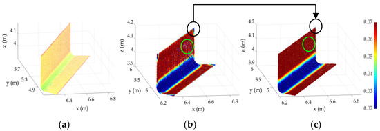 Given a calibrated point cloud collection instrument (assumption of modeled systematic errors), the point measurement uncertainties in the Cartesian coordinate system (i.e., spatial uncertainty [38]) can be modeled through the propagation of instrumental measurement errors, typically approximated to the first order [40]. For instance, in TLS, the spatial uncertainty of points must incorporate the raw instrumental measurement errors (e.g., range and angular errors; see Equation (11) of [36]) along with possible scan station registration errors in the case of multiple scans (see Equation (5) of [16]). For each point, the variance propagation process provides a 3 × 3 covariance matrix, , as a measurement of spatial uncertainty. Closed formulations of the 3D positional uncertainty, , as a function of instrumental measurement errors can be found in Maalek et al. [16] for TLS (Figure 1a), Zhengchun et al. [38] for the laser radar measurement system (LRMS), Mourikis and Roumeliotis [41] for SLAM-based instruments (Figure 1b), and Beder and Steffen [42] for SfM-based techniques (Figure 1c). For each point, , the corresponding spatial uncertainty, , can be used to construct an error ellipsoid as follows: