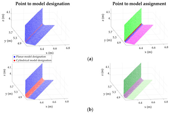 - Distance metric: Since the distance threshold is the basis for the assignment or rejection of a point to an element, without a priori knowledge of the construction errors, the threshold will be a guess at best. The impact of the subjective definition of (introduced in the previous section), even for the case without construction errors, was thoroughly discussed in Section 3.2.