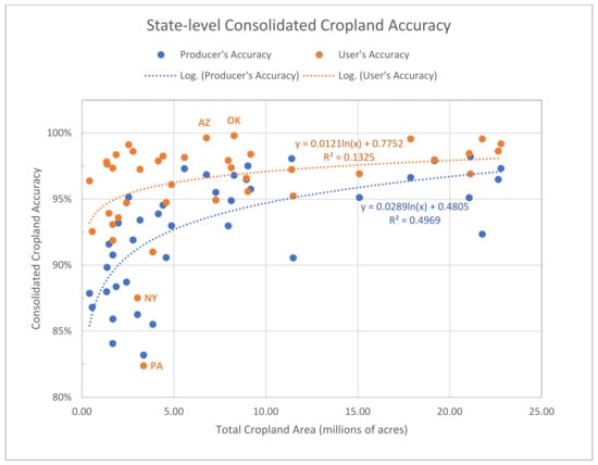 In 2012, 30 of the 40 state or multistate assessment regions of the CDL had consolidated cropland producer’s accuracies of 90% or greater (Appendix A Table A3). On the user’s sides, all but two states—New York and Pennsylvania—mapped cropland correctly 90% of the time or greater. Oklahoma (OK) and Arizona (AZ)—more arid states where cropland contrasts with the surrounding landscape and is often irrigated—had the highest cropland user’s accuracies, with values over 99%. More broadly, states with greater amounts of cropland typically had higher consolidated cropland accuracies (Figure 1), though this effect appeared to saturate beyond a certain threshold of crop area (e.g., 5 million acres). Similar trends were also observed when assessed by proportion (rather than total area) of cropland within each state [,].