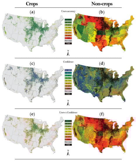 Panel of the user’s accuracy (a,b), confidence layer (c,d), and combined product of user’s accuracy and confidence layer (e,f) delineated for crop (a,c,e) and non-crop (b,d,f) classes of the CDL for 2012.