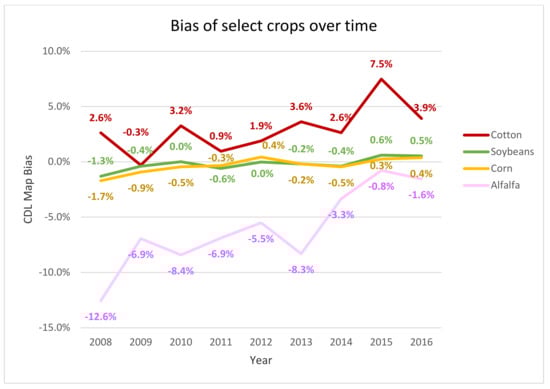 Assessing the changes in mapped biases over time may also aid in understanding the true dynamic compositions of crops on the landscape. Figure 4 charts the simple bias of four major crops over time. According to the estimates, the mapping of both corn and soybeans by the CDL relative to their reference data have increased only slightly, and in tandem, over time. In contrast, alfalfa has gone from being under-mapped by 12.6% relative to the reference data in 2008 to being under-mapped by only 1.6% in 2016, which marks a considerable change over time. As a result, estimates of alfalfa area based on direct CDL pixel counts could embody a sizeable artificial increase.