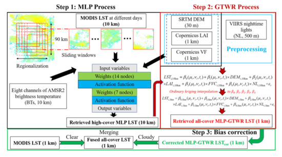 The multilayer perceptron-geographically and temporally weighted regression (MLP-GTWR) method is composed of three processes (Figure 2). The first process is to predict the 10-km daily all-weather LST by the MLP models; the second process is to downscale the 10-km LST to 1 km and fill the gaps with the GTWR method; and then the 1-km PMW-based gap-free all-weather LST is fused with the MODIS LST via bias correction. The following subsections illustrate the methods and validations in detail.