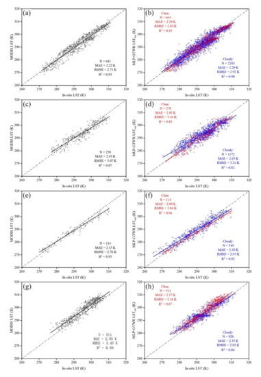 The scatterplots in Figure 4 show the comparison of the MLP-GTWR LSTcor and MODIS LST against the in situ LST measurements at four flux towers. The former all-weather LST was divided into two parts: clear-sky and cloudy-sky, decided by the MODIS clear-sky LST. Overall, the measured in situ LST showed good agreement with the MODIS LST at four sites, with MAE, RMSE, and R2 varying between 2.15–2.95 K, 2.72–3.45 K, and 0.88–0.95, respectively. The metrics of the flux-based in situ LST used in this study were comparable to those from the literature involving the validation of the MODIS LST [25,48], indicating a good spatial representative to evaluate the 1-km gridded LST. For the MLP-GTWR LSTcor under clear-sky conditions, the MAE, RMSE, and R2 varied within the range of 2.29–2.85 K, 2.83–3.44 K, and 0.87–0.96, respectively. These results certify that the performance of the MLP-GTWR LSTcor under clear-sky condition is comparable and similar to that of the MODIS LST at all flux sites.