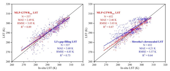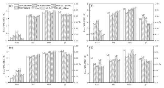 Figure 3 shows the comparison between the MLP-GTWR LST (not bias-corrected) and the 1-km MODIS LST for clear pixels across the entire study area. After the MLP and GTWR processes, the overall mean bias, MAE, RMSE, and R2 between both LSTs were 1.17 K, 2.15 K, 2.99 K, and 0.91, respectively, and the standard deviations of the bias, MAE, RMSE, and R2 were 0.87 K, 0.72 K, 0.85K, and 0.05, respectively. The result that the RMSE was less than 3 K and the R2 was higher than 0.9 in most regions indicates a close agreement between the MLP-GTWR LST and MODIS LST under clear-sky conditions.